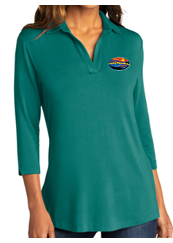 Ladies 3/4 Sleeve Polo, 7-button placket with metal buttons, pleated back yoke. OGIO badge at hem. Embroidered logo on front.